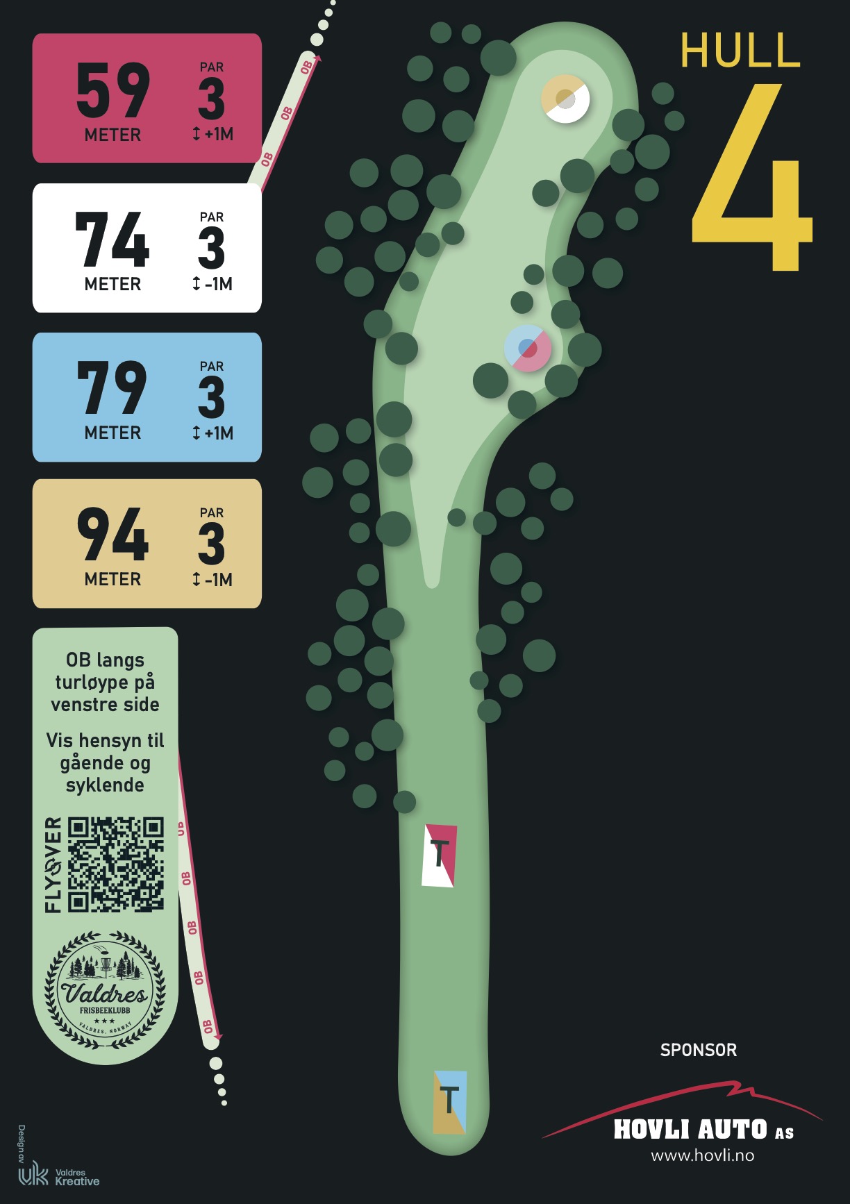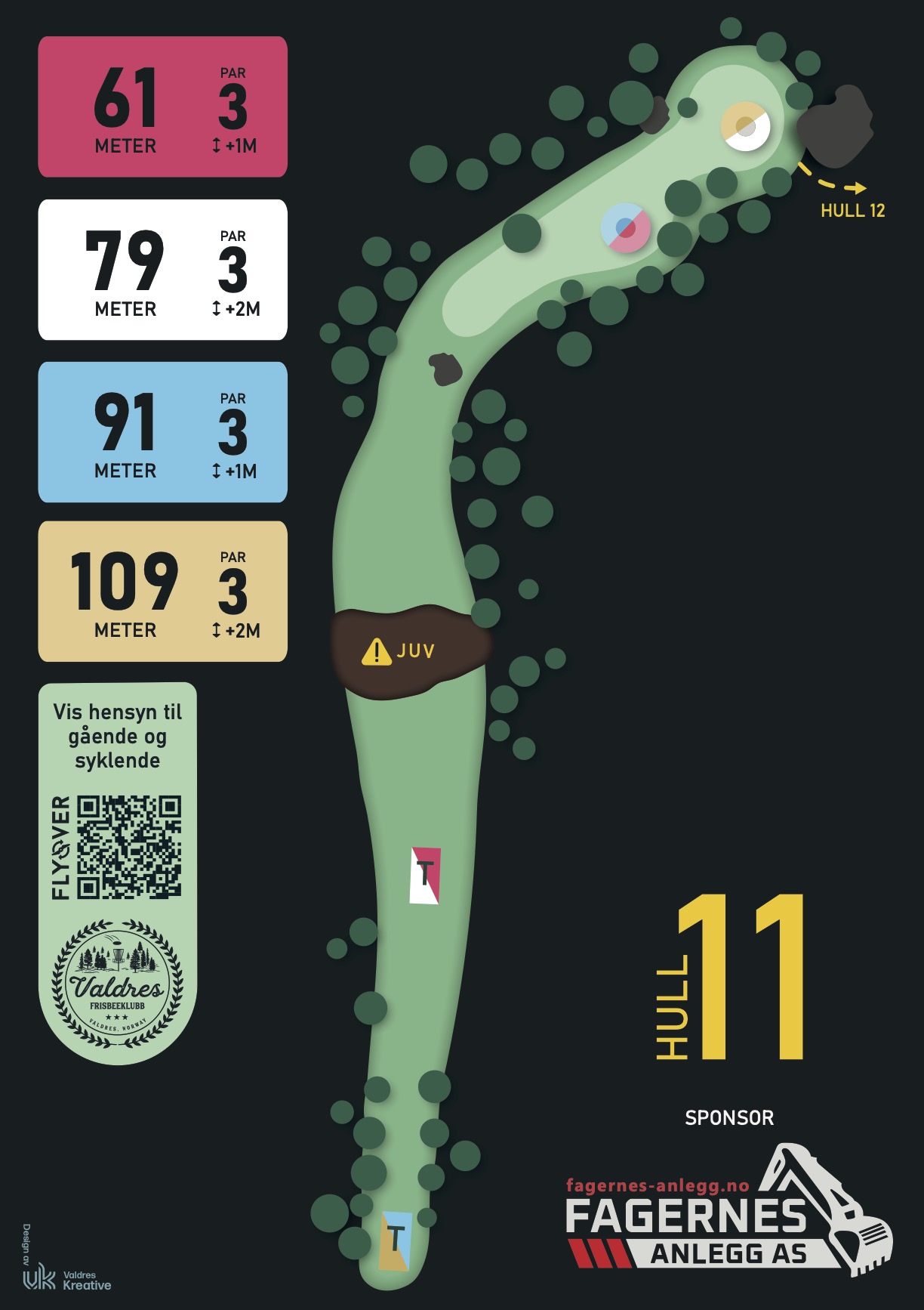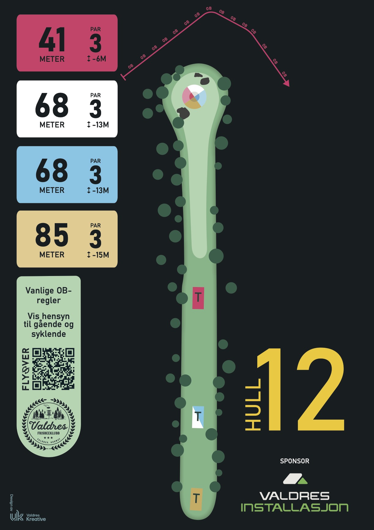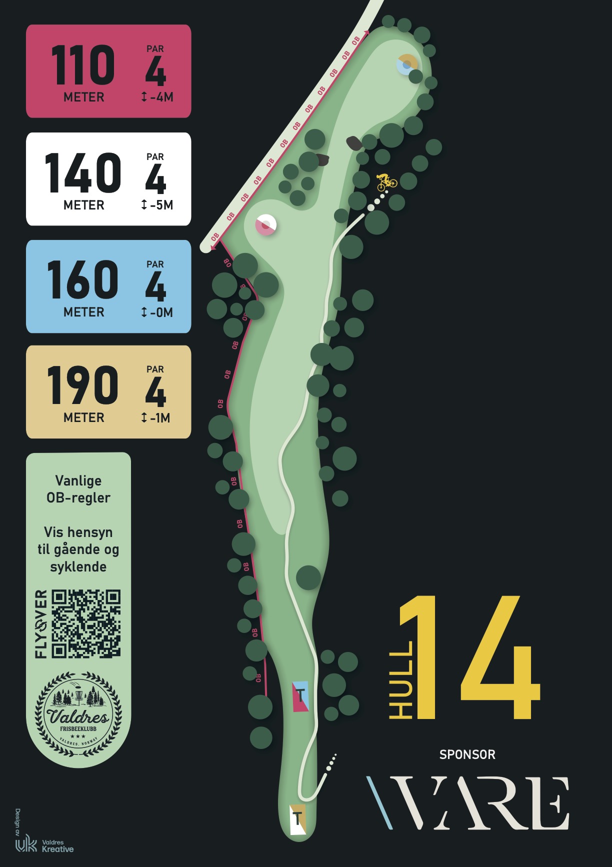 OB langs vei på høyre side og mellom hull 13 og 14 på venstre side. Helt nytt hull langs Fløafjordvegen.