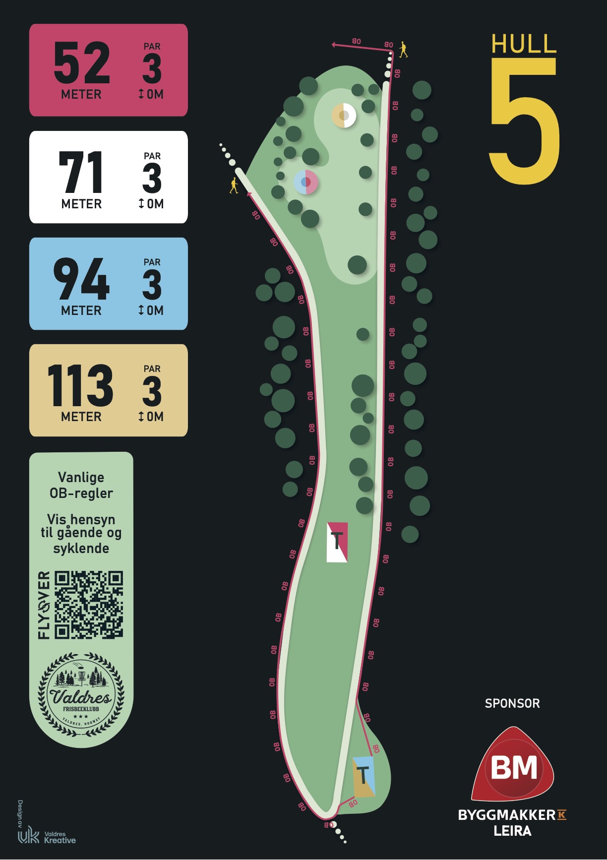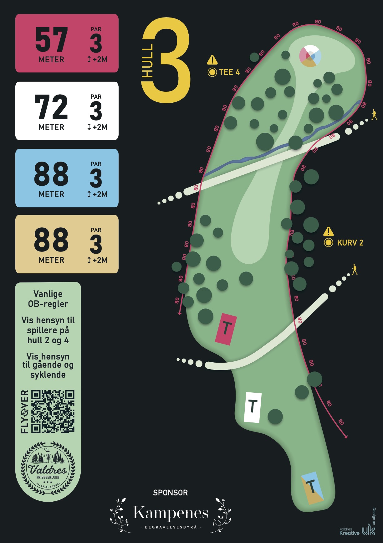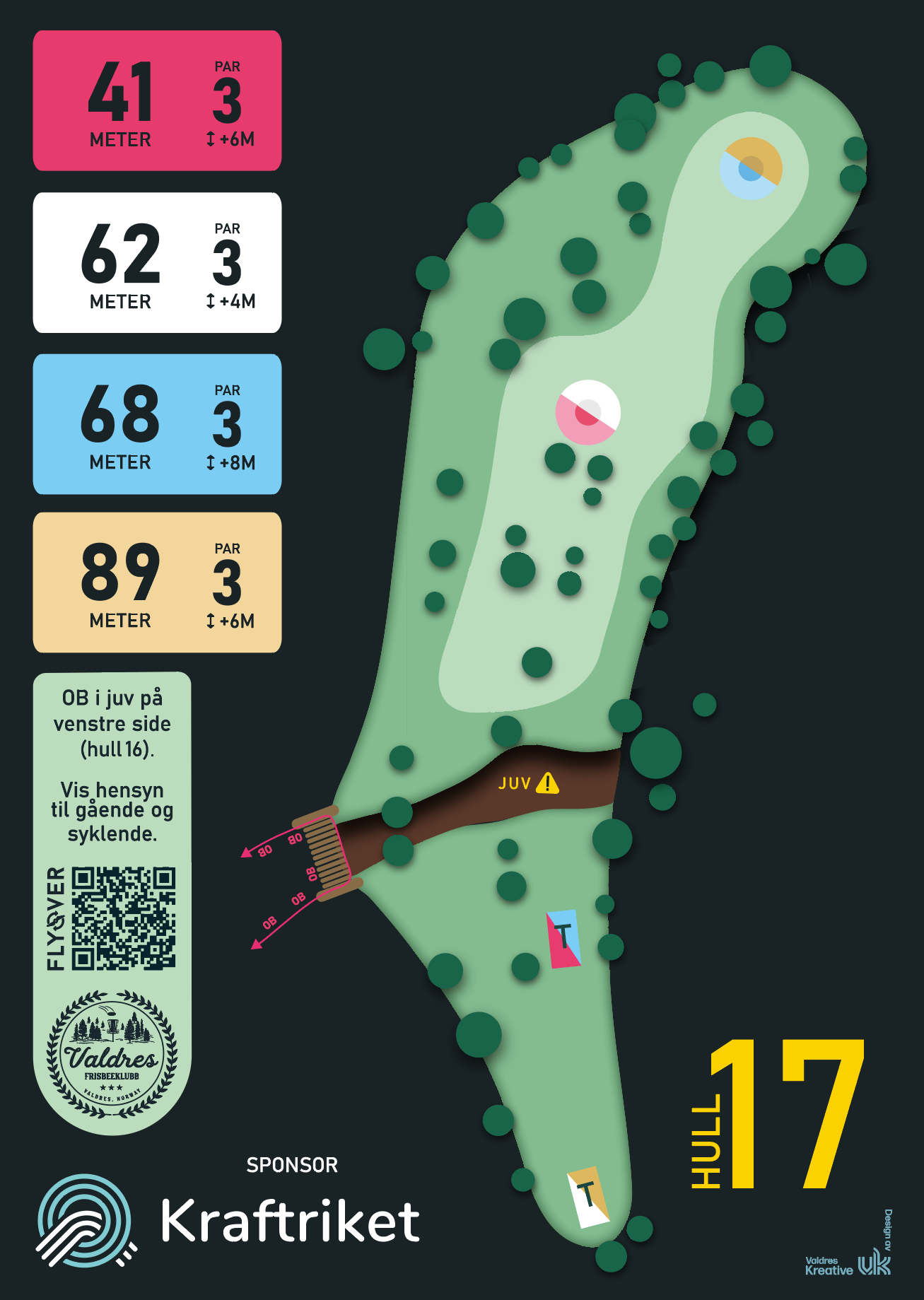 OB langs vei på høyre side og mellom hull 13 og 14 på venstre side. Helt nytt hull langs Fløafjordvegen.